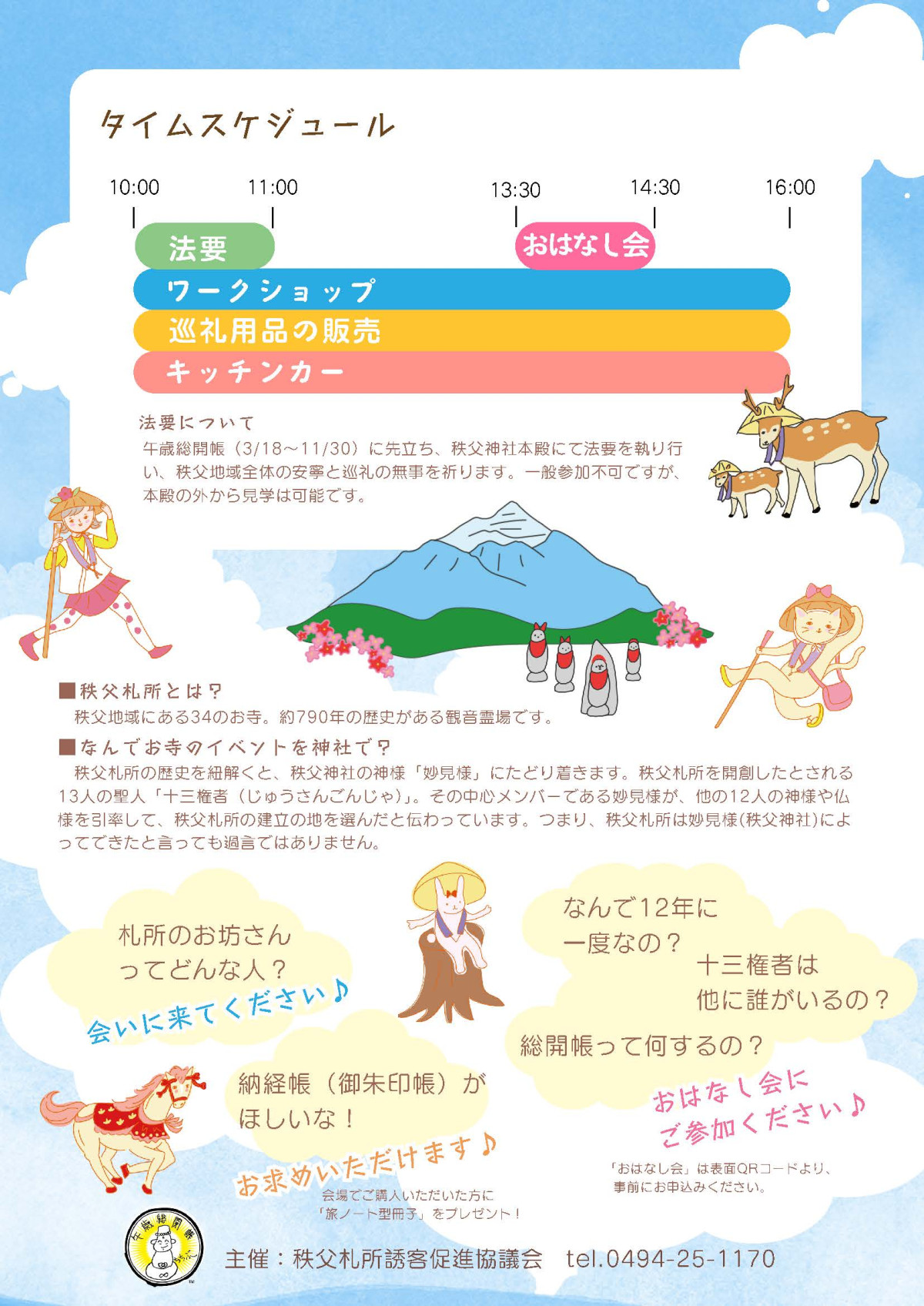 間もなく始まる「秩父札所午歳(うまどし)総開帳」の機運を高めようと、秩父神社(秩父市番場町)で3月1日、「みんなのふだしょDAY」が開催される。