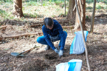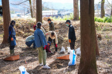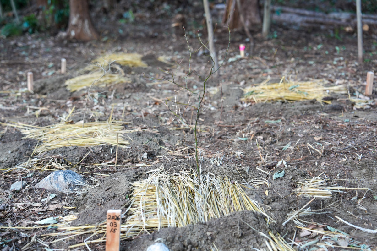 苗の乾燥を防ぐための落ち葉を敷き、その上から稲わらをかぶせた。