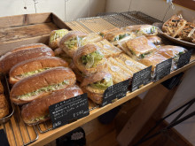 店頭には、定番の山型食パン(1斤420円)に加え、濃厚バターパン(80円)、甘い系のこしあんパン、クリームパン、ミルクフランス(以上220円)、たまごサンド(260円)、きのこグリルサンド(490円)などの調理パンも並べる。1日に1~2個だけ焼くパンもあるという。