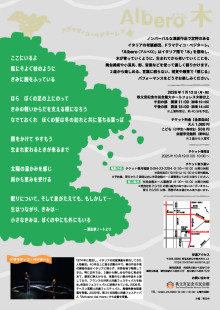 作品タイトルの「Albero」は、イタリア語で「木」を意味する。木が芽吹き、成長し、時を重ねていく姿を、人が生まれてから老いていく過程に重ねて描く構成となっている。舞台では物語を言葉で説明することはせず、照明や音楽、影、砂やオブジェなどを用いながら場面を積み重ねていく。