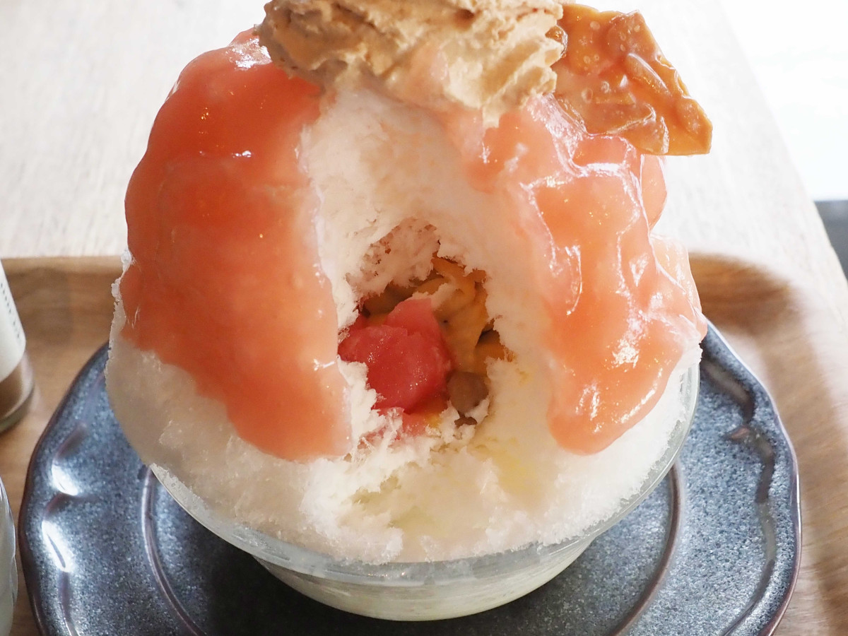 「層で味わう」ことをコンセプトに、一皿のかき氷を上・中・下で味や食感が異なる構成にしているのが特徴。