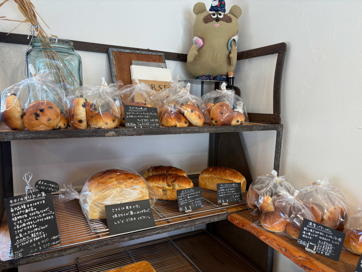 パンを見守る「たぬー」(右上)はお店のマスコットキャラクター