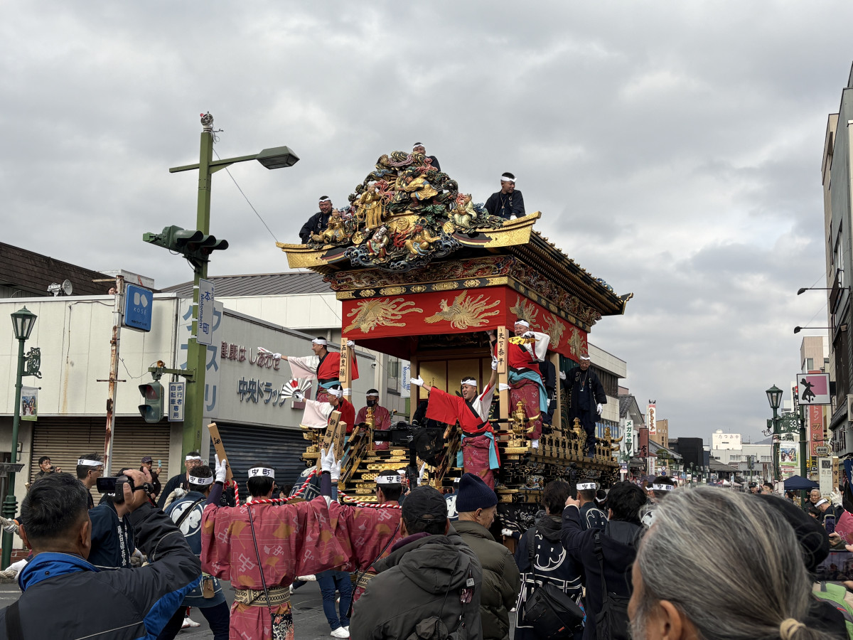 秩父神社の例大祭「秩父夜祭」に向け12月2日13時過ぎ、屋台芝居当番町の中町屋台が旧ベスト電器(秩父市中町)前に到着した。