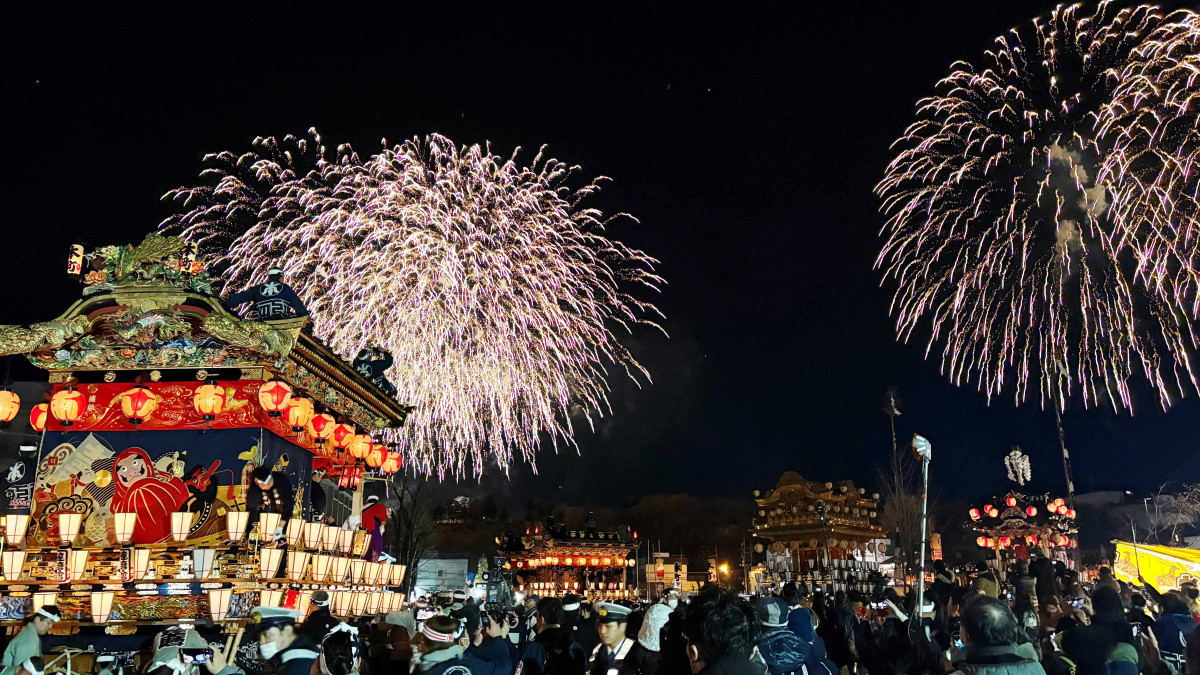 本町屋台が御旅所に到着して6基の山車がそろい、冬の夜空に花火が上がっていた