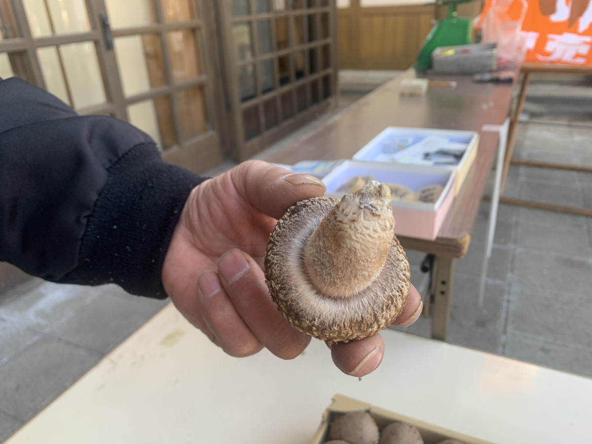 軸が太いシイタケは、栄養をしっかり吸収して育った「肉厚で旨味が詰まった高品質なサイン」だという