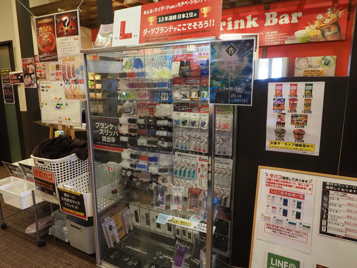 受付前にはダーツグッズの販売棚が設置されている