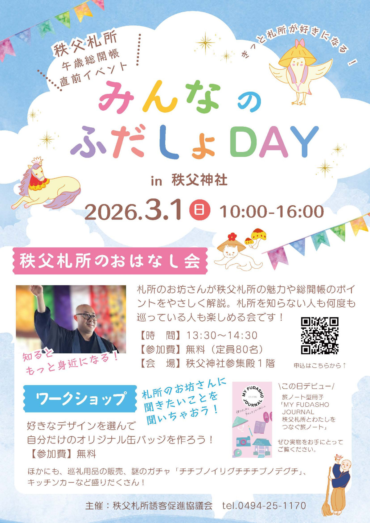 間もなく始まる「秩父札所午歳(うまどし)総開帳」の機運を高めようと、秩父神社(秩父市番場町)で3月1日、「みんなのふだしょDAY」が開催される。