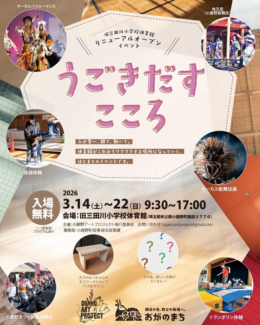 小鹿野町飯田の旧三田川小学校(小鹿野町飯田)体育館で3月14日、リニューアルを記念したイベント「うごきだすこころ」が始まる。
