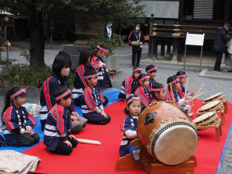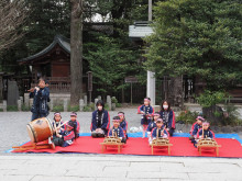 秩父神社(秩父市番場町)の境内で3月13日、日野田保育所(日野田町)の年長児11人が秩父屋台ばやしを披露した。