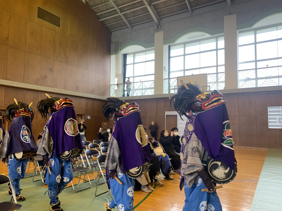 体育館の入り口から獅子たちが登場