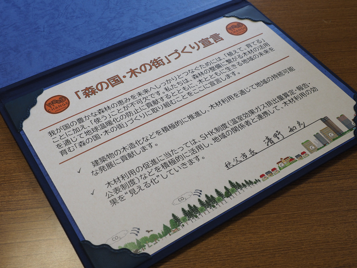 秩父市は3月23日、森林資源の循環利用と街の木造化を推進する農林水産省の「『森の国・木の街』づくり宣言」に賛同し、同宣言を行った。
