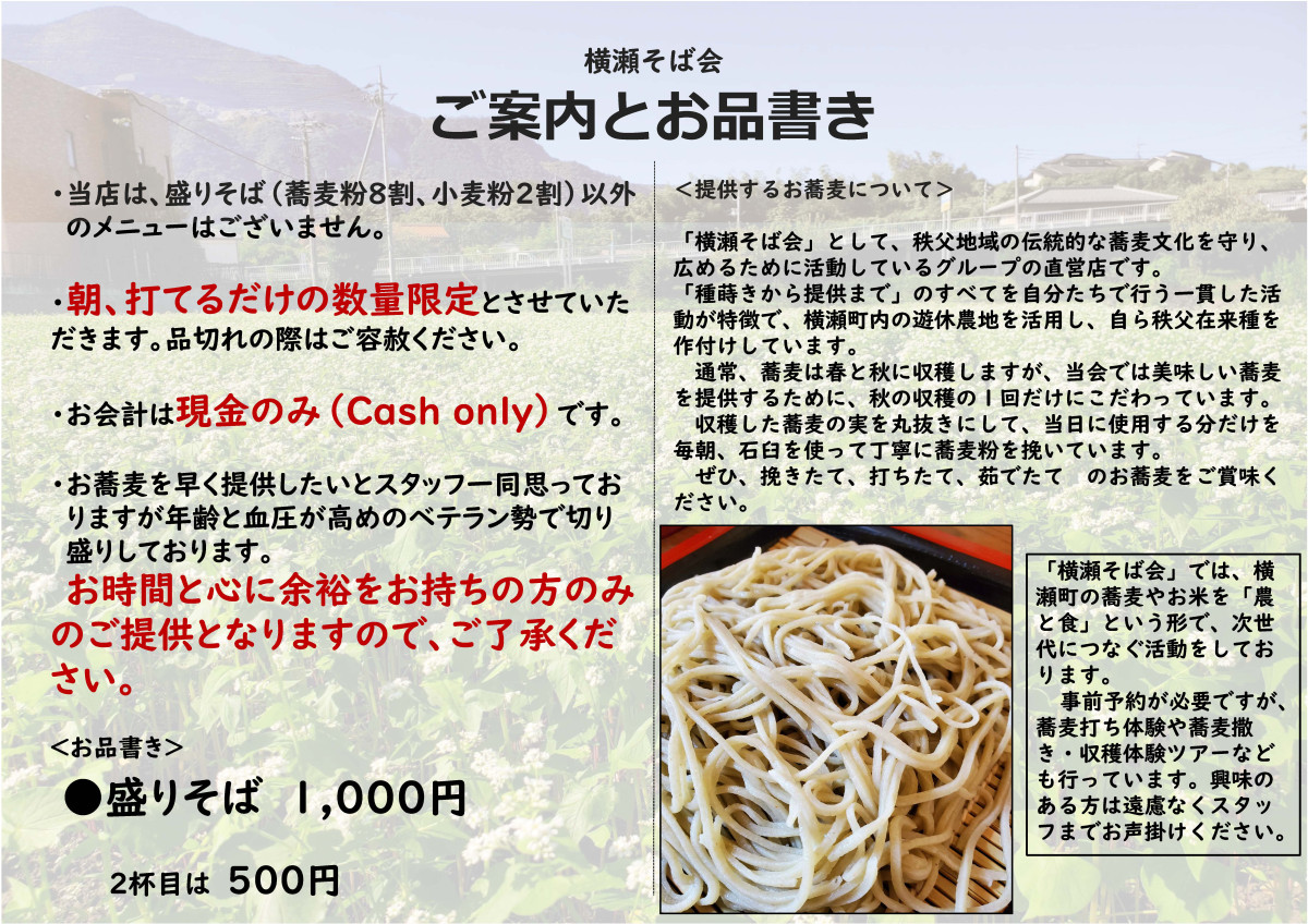 横瀬町で活動する「横瀬そば会」が4月12日から、町内の遊休農地で栽培した秩父在来種のそばの提供を「そば処 伸平(しんべい)」(横瀬町横瀬)で始める。