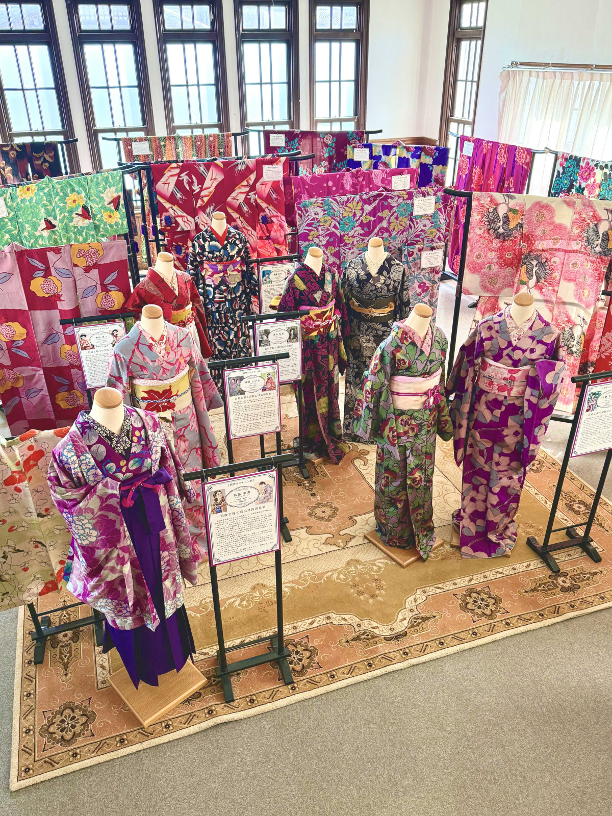 竹久夢二ら叙情画家7人の作品世界をイメージした銘仙展示