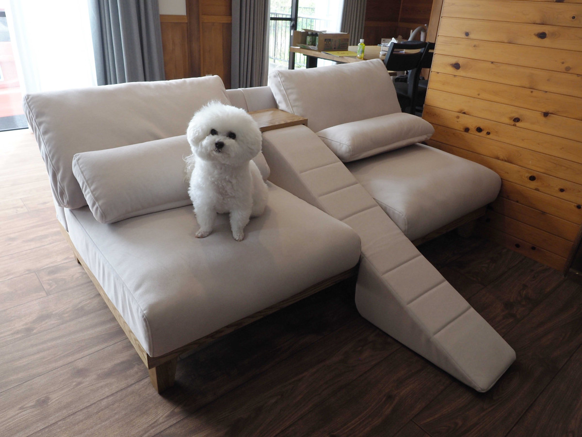 リビングのソファはの肘掛け部分は、ペット用のスロープにもなる